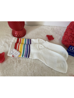 Craque pour ces chaussettes blanches à rayures arc-en-ciel : fun, confortables et résolument proud ! Parfaites pour les marches, les looks sportswear ou juste pour affirmer ton style au quotidien. 🧦 Détails du modèle : Chaussettes blanches montantes Rayures arc-en-ciel tissées en haut...