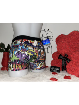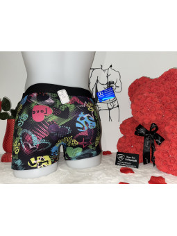 💖 Explosion de couleurs et de motifs street art : cœurs, étoiles, taches néon, graffitis LOVE et symboles fun pour un style qui claque !Confortable et totalement unique, ce boxer fera tourner les têtes 😎 📏 Taille à plat (cm) : Taille (ceinture à plat) : 37.5 cm 🧵 Composition : 93...
