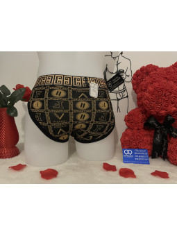 Apporte une touche de luxe et d’audace à ton tiroir à sous-vêtements avec ce modèle noir et or, au motif inspiré des grandes maisons de couture. Le look est puissant, l’effet est garanti. 🖤 Détails du modèle : Slip noir à imprimé doré style "baroque chic" Ceinture élastique logotypée...